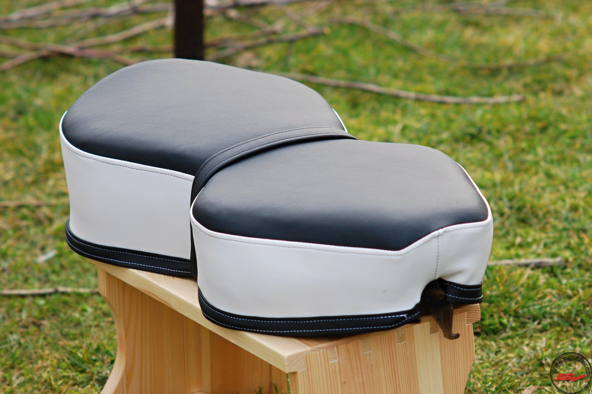 Je to originál – první modely (rok 1961) ČZ 455 měly kytaru právě v tomhle provedení (červené zbarvení pak mělo černočervená sedadla). Od roku 1962 už pak mají lavici a ta je jednobarevná. Kombinace chromy + černá + bílá se mi strašně líbila, tak jsem to tak nechal udělat :-). Sice to teda bylo vybíraní vhodného materiálu (sehnat stejnou koženku v bílé a černé se stejným dezénem a na venkovní použití je docela fuška). Ale výsledek rozhodně předčil očekávání :yahoo:.