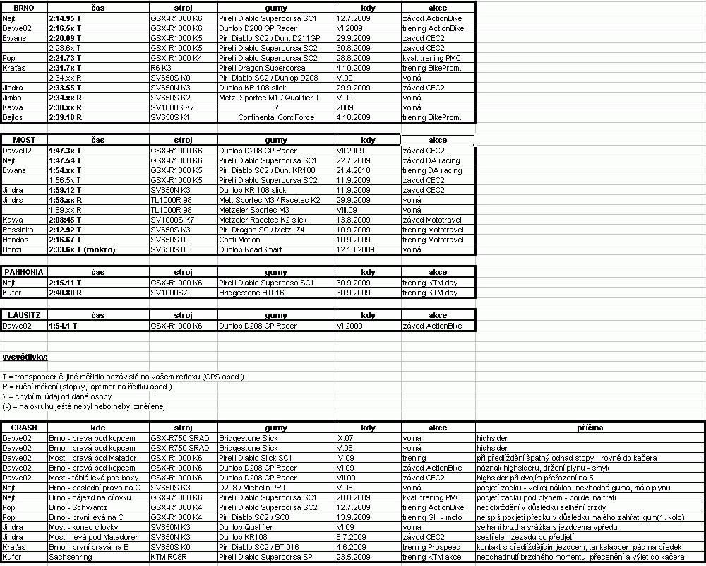 casy: Sachsenring, 1:52,143 T, KTM RC8 R, Pirelli Diablo Supercorsa SP, 21.05.2010, KTM T'n'T Sachsenring, 2:01,848 T, KTM SuperDuke R, Pirelli Diablo Rosso, 21.05.2010, KTM T'n'T Most, 2:05,221 T, GSX-R 1000 K5, Dunlop D211 GP Racer Medium, 08.06.2010, Racetrack.cz